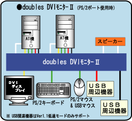 | 切替方式 | [ノーマルモード(PS/2ポート使用時)] −doubles本体の「SELECT SW」による切替。 −ショートカットキーによる切替。 (Ctrl+Alt+Shift)・(Ctrl+Alt+Bs)・(Ctrl+Alt+Z)DIP-SWにて選択 [USBモード(USBポート使用時)] −doubles 本体のセレクトスイッチにて切替。 |