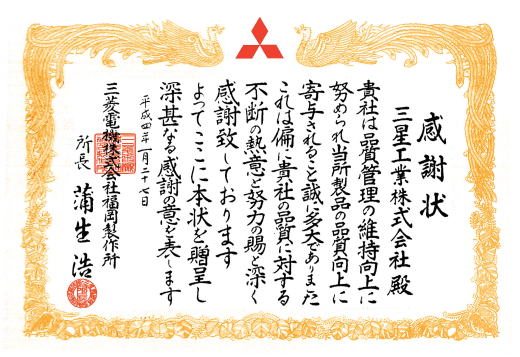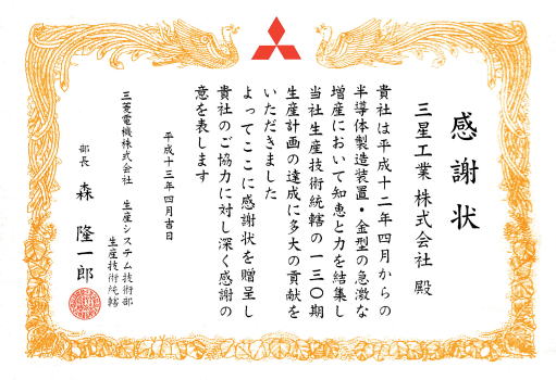 2001年4月 三菱電機株式会社 生産システム技術部 より 弊社の品質維持・向上への貢献に対し、感謝状を授与