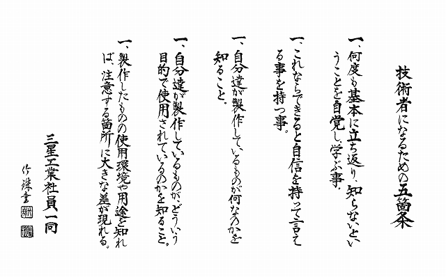 社員の立案で生まれた「技術者になるための五箇条」をモットーに、社員全員が一丸となって、一歩先を見据えた技術の研鑽に取り組んでいます。